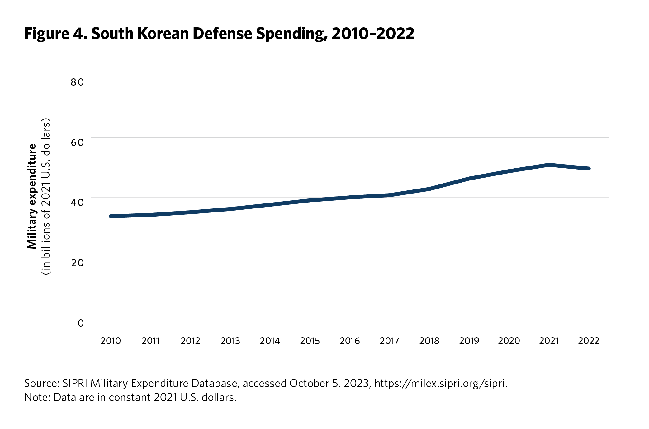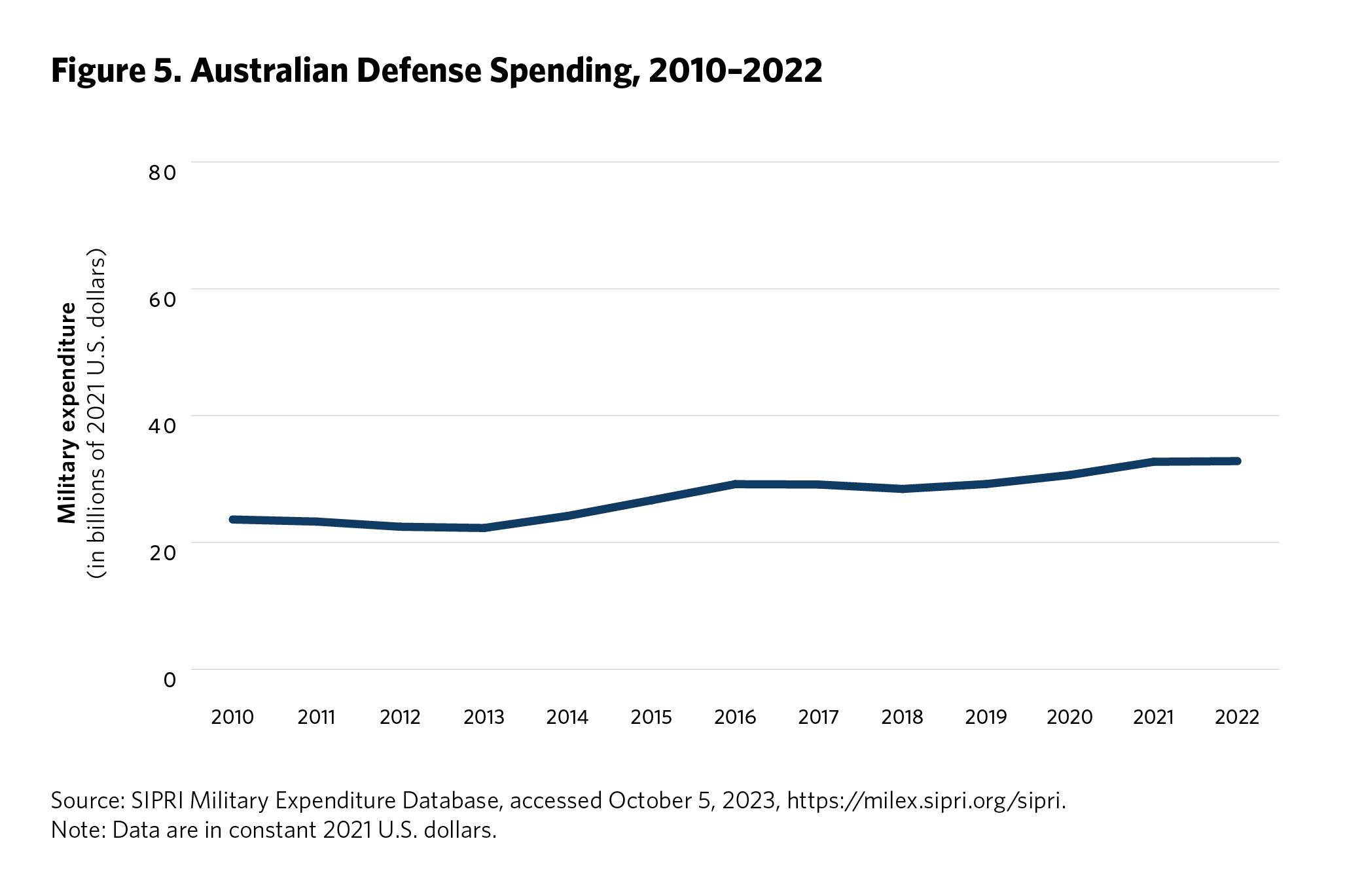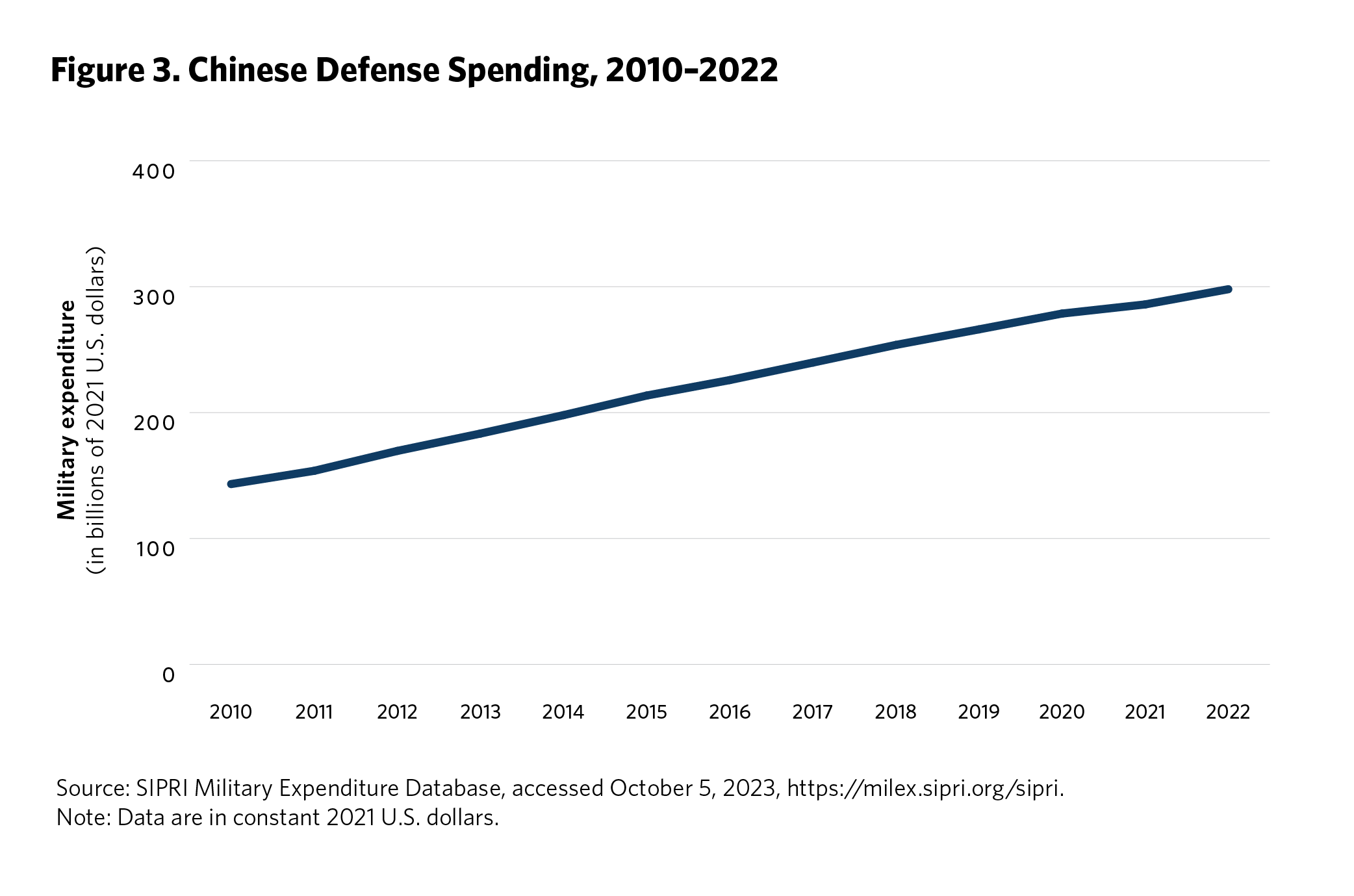 5 Ken Moriyasu, “‘Geopolitical Powder Keg’ Asia Jacks Up Global Military Spending,” Nikkei Asia, August 25, 2022, https://asia.nikkei.com/Politics/International-relations/Indo-Pacific/Geopolitical-powder-keg-Asia-jacks-up-global-military-spending . Time series data on regional defense spending is available from the SIPRI Military Expenditure Database, Stockholm International Peace Research Institute, accessed September 2023, https://www.sipri.org/databases/milex.
