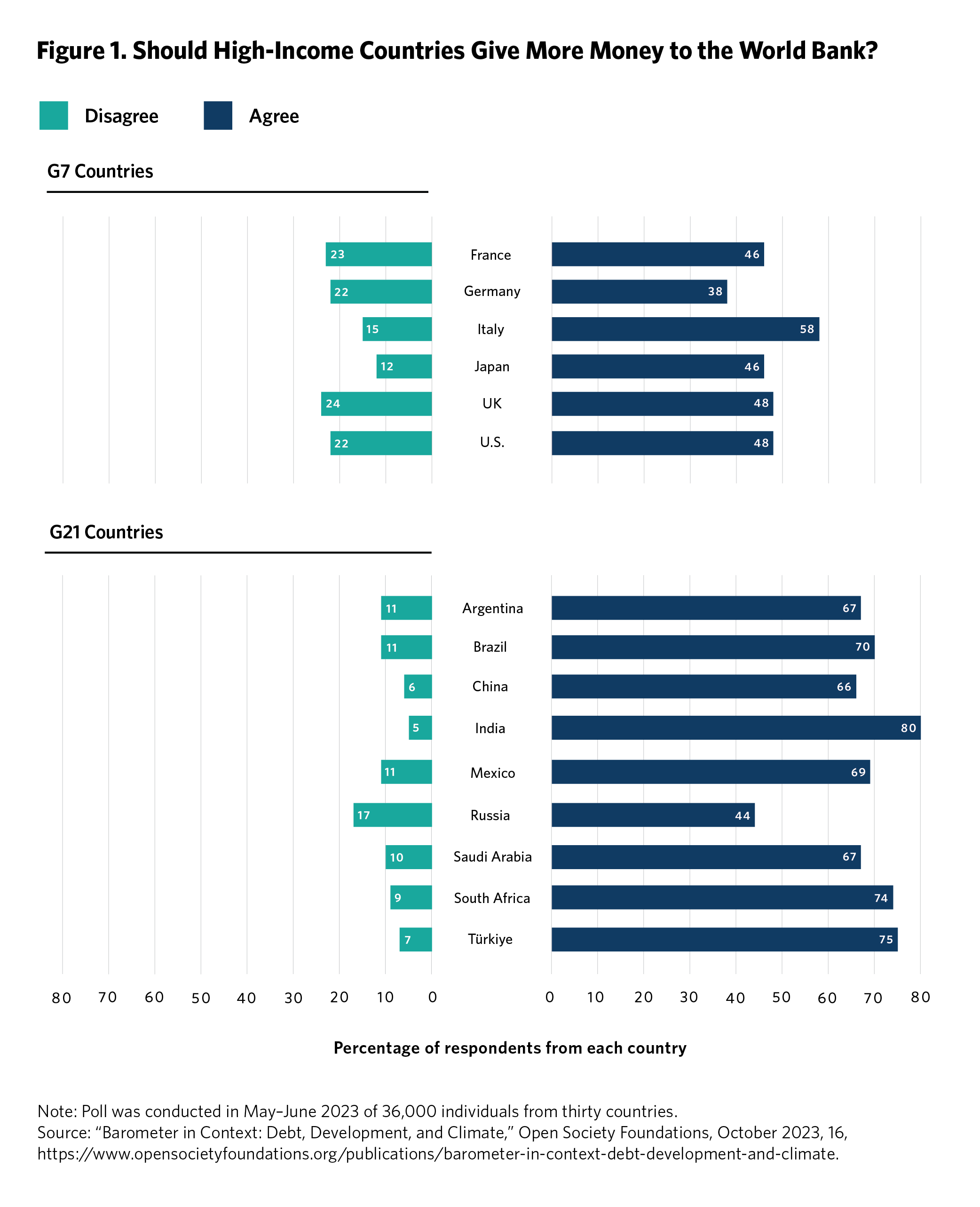 Public polling across a range of countries shows widespread support for the idea that governments should spend 2 percent of GDP on “People and Planet”: investments that protect the environment and contribute to human development. Over a third support the proposal in G7 countries and as much as 70 percent support it in African countries.3 As shown in Figure 1, support for giving the World Bank more money to respond to global crises sits between 38 percent and 58 percent in G7 countries and between 44 percent and 80 percent in selected G21 countries.